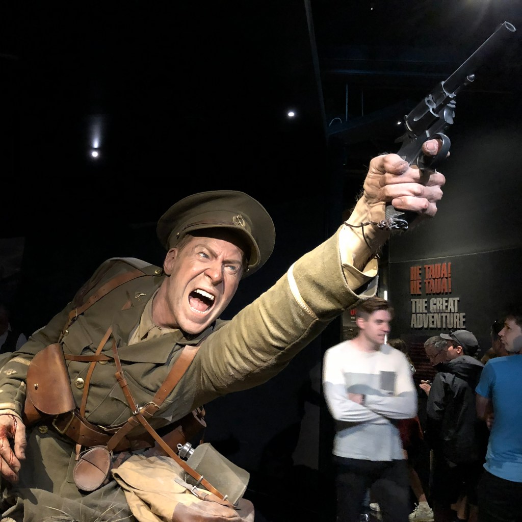 The unforgettable Te Papa exhibition on Gallipoli gets its power from brilliantly executed, larger than life dioramas of dramatic moments from the battle such as the one depicted above. In the photo, the eye is confused as a strikingly real looking NZ soldier lunges forward in the foreground, firing his pistol even as his lifeblood drains from a mortal wound; while at the same time in the background, an uninvolved young man chats with a friend, ignoring the battle seemingly raging a few feet away.