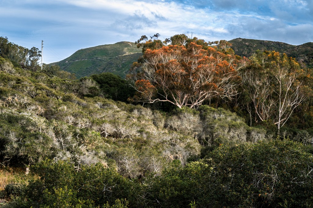 Anyway, as it happened maybe the best photo I got yesterday was one that I wasn’t expecting. And it didn’t even involve water. While I was lining up a shot over Morro Bay from another eminence in Montaña de Oro, I happened to look behind me, across the road, to a lovely dense grove of eucalyptus trees. (Or some kind, anyway. Not a tree expert.)